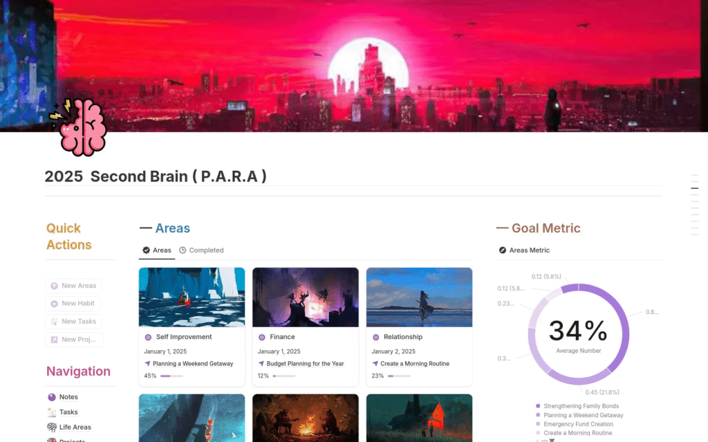 This is a second brain template also inspired by the PARA method, which categorizes projects, areas, resources, and archives. You can use this template for organizing your information in one place.