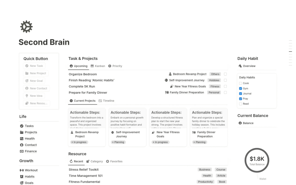 This is a paid second brain, which you can use to take your notes, tasks, goals, and resources in one place. It is beautifully organized and you can use it to manage all your projects and finances in one place.