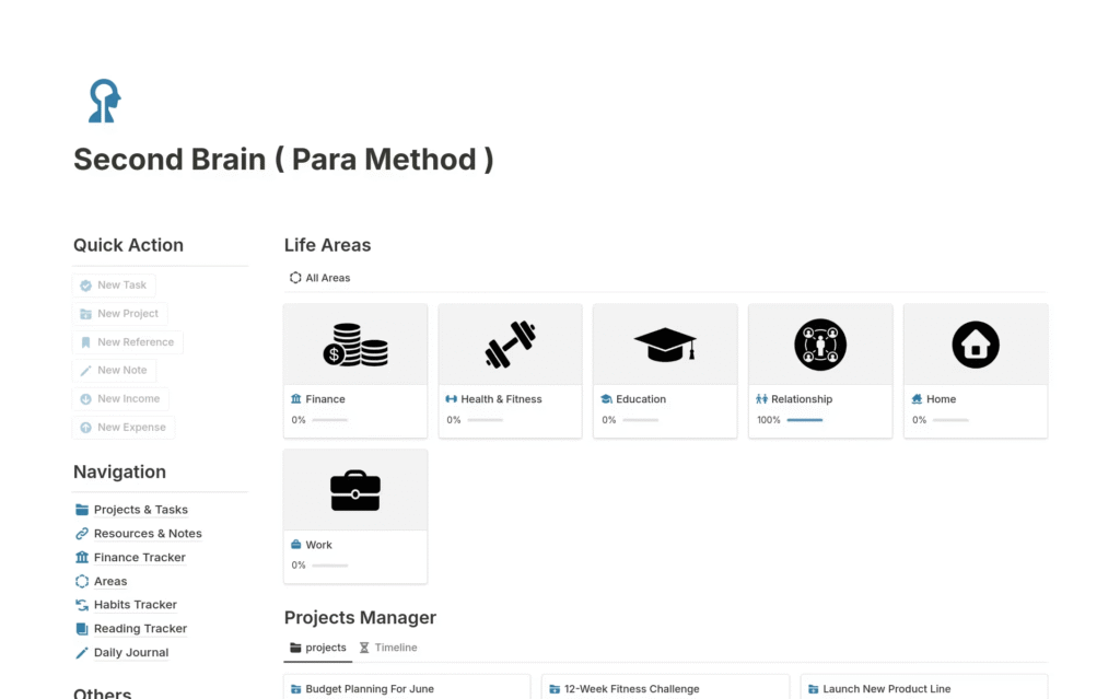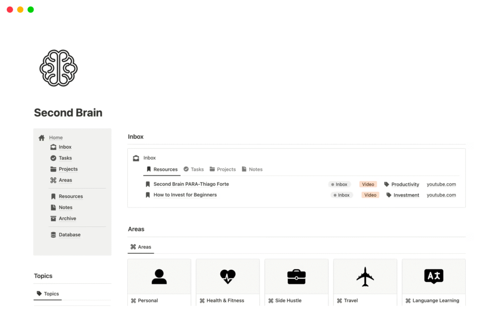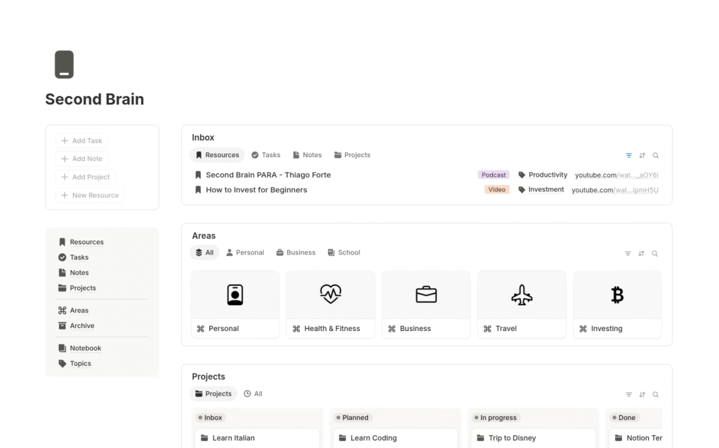 It is a useful second brain template that you can use to capture, organize, and retrieve information effectively. The system allows you to collect all your ideas, thoughts, and projects in one place, which you can refer to at some other time.